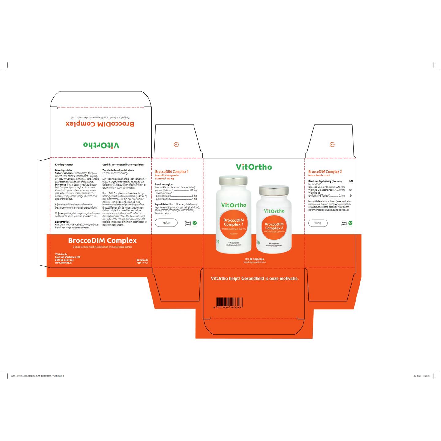BroccoDIM Complex 1: Broccolikiemen, Rijstebloem, Capsulewand (Hydroxypropylmethylcellulose), Antiklontermiddel (Magnesiumstearaat), Bamboe extract, BroccoDIM Complex 2: Mosterdzaad (Mosterd), Vitaminen, Capsulewand (Hydroxypropylmethylcellulose, Enterische coating), Rijstebloem, Gefermenteerde leucine, Bamboe extract.