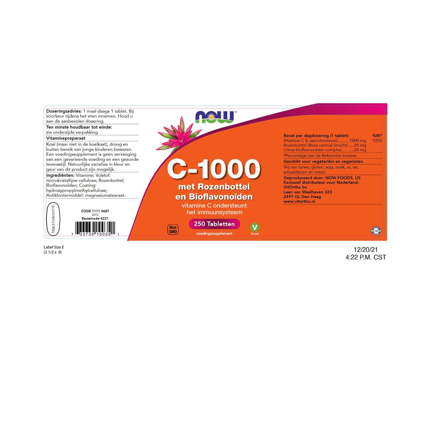 Vitamine C (ascorbinezuur), Vulstof (Microkristallijne cellulose), Rozenbottel (Rosa canina) vrucht, Citrus bioflavonoïden complex, Coating (Hydroxypropylmethylcellulose), Antiklontermiddel (Magnesiumstearaat).